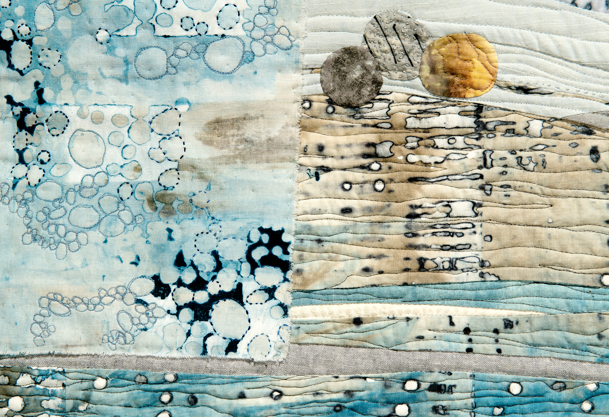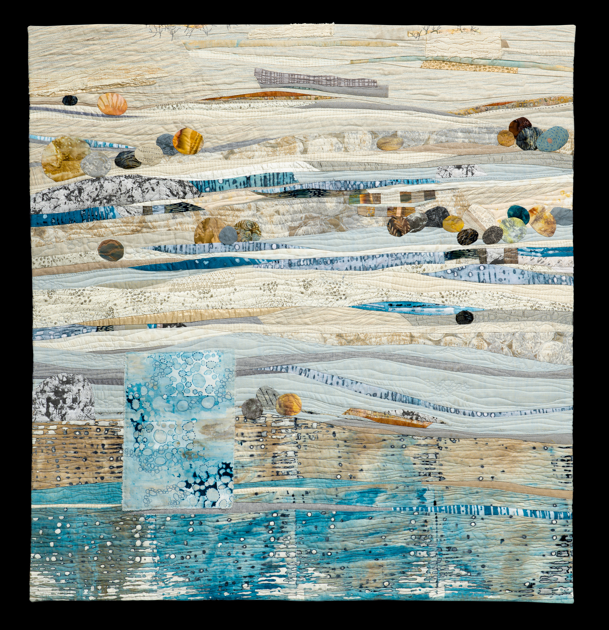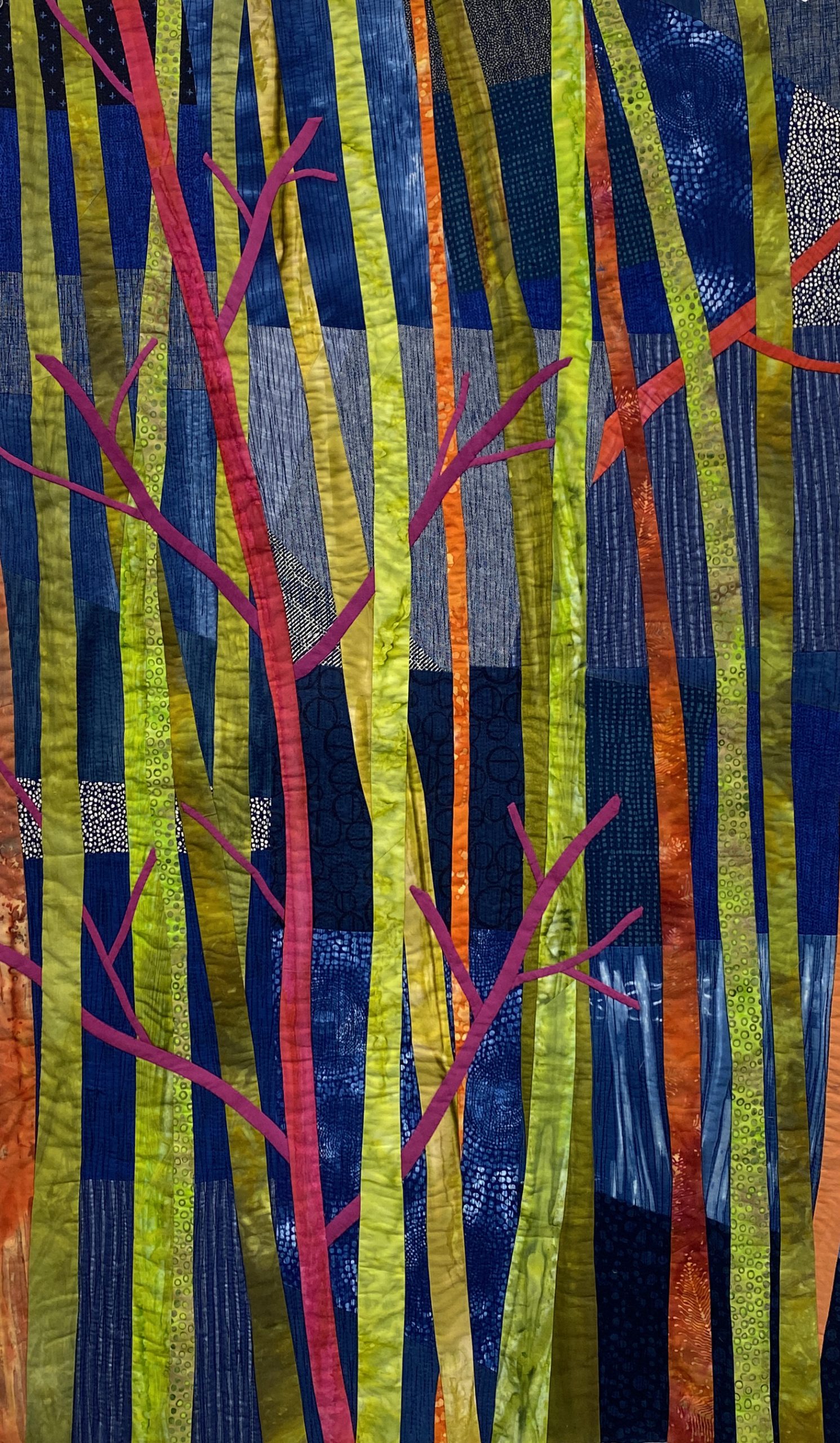 Recurring themes in my textile art have to do with natural configurations: rocks, trees, grasses, flowers, ocean, and the land. They are the common thread running through my mind as I work intuitively designing quilts letting the designs take on a life of their own. I am fascinated with line, pattern, shape, color, and texture, and how to design with these elements capturing the essence of what I see and feel. My favorite quotation is from Emerson, “Nature always wears the colors of the spirit.”